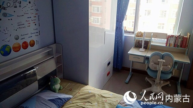 在對原有住房進行規(guī)劃、設計后,施工隊開始裝修,并配備必要的家具、臥具和學習生活用品。歷時半個多月,一間以藍色為主色調(diào)的小屋建成了?,F(xiàn)在,屬于浩博的那一半臥室,泛黃的臥室墻壁被粉刷成淡藍色,換了新的小床和衣柜,新添置的書桌上擺滿了課外書,看起來整潔又溫馨。