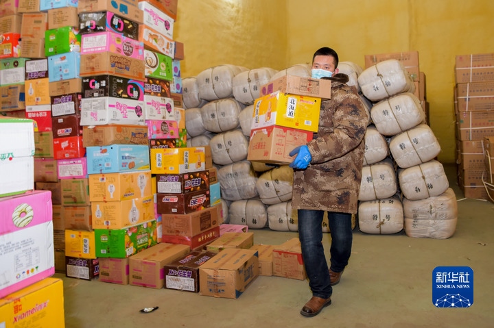127日,在滿洲里市一物資儲備庫,工作人員王永亮在搬運物資。新華社記者魏婧宇 攝
