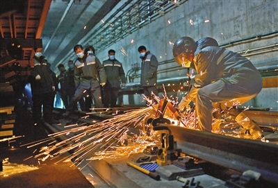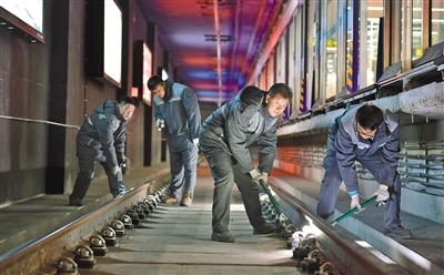 昏暗、逼仄的軌行區(qū)內(nèi),軌道檢修師們焊接鋼軌時迸發(fā)的火花顯得格外耀眼,維修軌道設(shè)備時敲擊鋼軌的聲音顯得格外清脆、響亮。據(jù)田智宏介紹,一個軌道檢修師每次夜間軌行區(qū)的巡檢作業(yè)大約要走7公里路程。他和工友們每天要檢查數(shù)千個部件,測量上百個數(shù)據(jù),其中一項重要巡檢工作就是檢查扣件和接頭聯(lián)結(jié)零件的組成部件是否安裝牢固,螺栓是否松動。他指了指自己腳上的鞋說:“我們的檢修對象不僅笨重且危險性較高,為了防止腳部受到傷害,鞋子都是特制的防砸絕緣鞋?!?/p>
