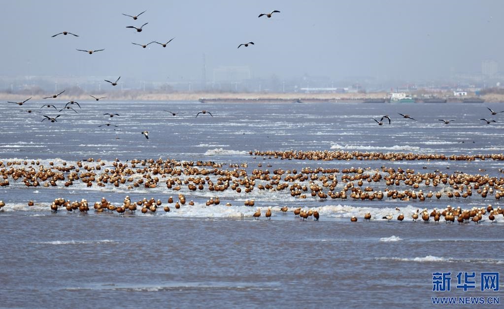 2021年11月27日,在內(nèi)蒙古鄂爾多斯市達(dá)拉特旗,成群的候鳥棲息在剛剛封凍的黃河冰面上。新華社記者賈立君 攝