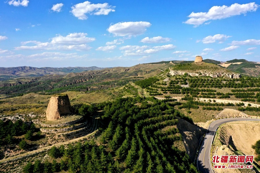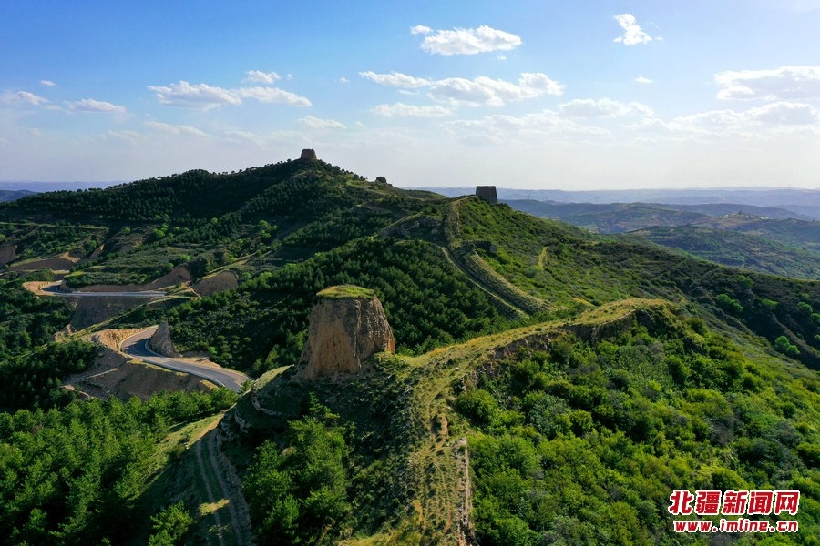 端午時節(jié),由G209國道岔口至老牛坡的公路正在緊張建設中。汽車沿著剛剛鋪好軟基的砂石路面行進,車窗外,高高低低的烽火墩臺聳立在山巒之上,巍峨雄偉,座座墩臺直沖云霄,蔚為壯觀。清水河縣明長城國家文化公園的核心區(qū)小元峁段長城(栜木塔長城)即位于此。