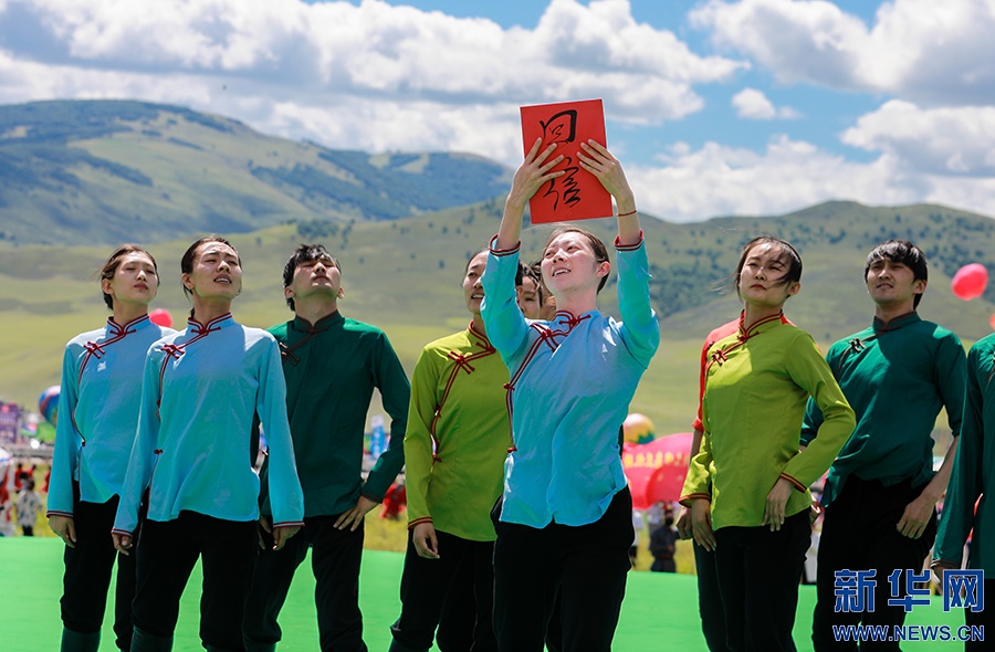 8月8日,烏蘭牧騎隊(duì)員們?cè)陂_(kāi)幕式上進(jìn)行文藝表演。新華網(wǎng)發(fā)(丁根厚攝)