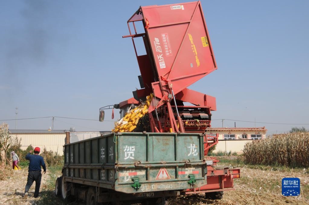 臨河區(qū)干召?gòu)R鎮(zhèn)黃濟(jì)村村民收割玉米。(新華社記者李云平 攝)