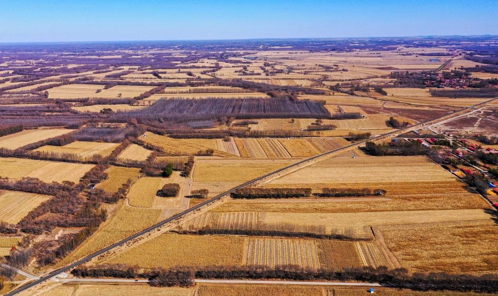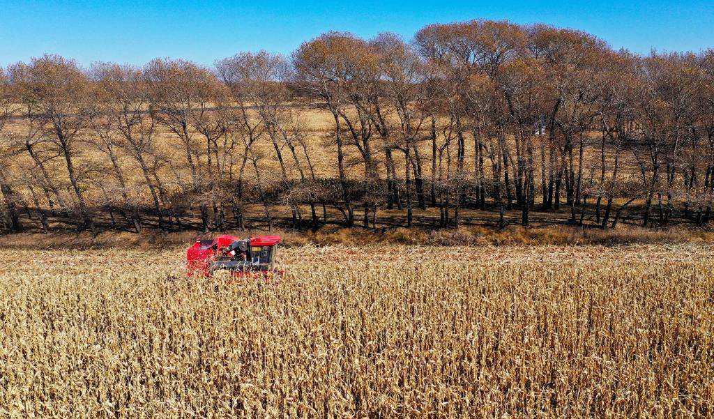 10月18日,這是通遼市奈曼旗新鎮(zhèn)正在收獲的玉米地。(無人機照片 新華社記者 連振 攝)