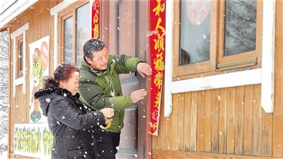 彭成良巡護回來,天上飄起了雪花。夫妻倆一起貼春聯(lián)、窗花,掛燈籠,凍冰燈。嶄新的木屋,紅紅的燈籠,醒目的春聯(lián),五彩的冰燈……被裝扮一新的管護站瞬間年味兒十足。為了讓春節(jié)更有儀式感,二人決定再堆兩個雪人。