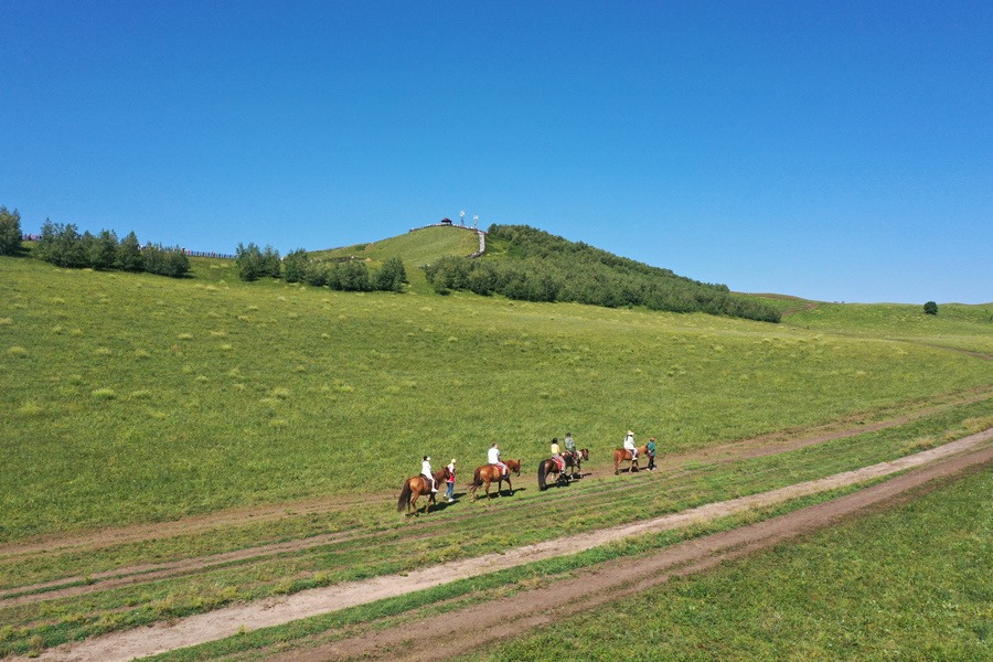8月2日,游客在烏蘭布統(tǒng)草原騎馬