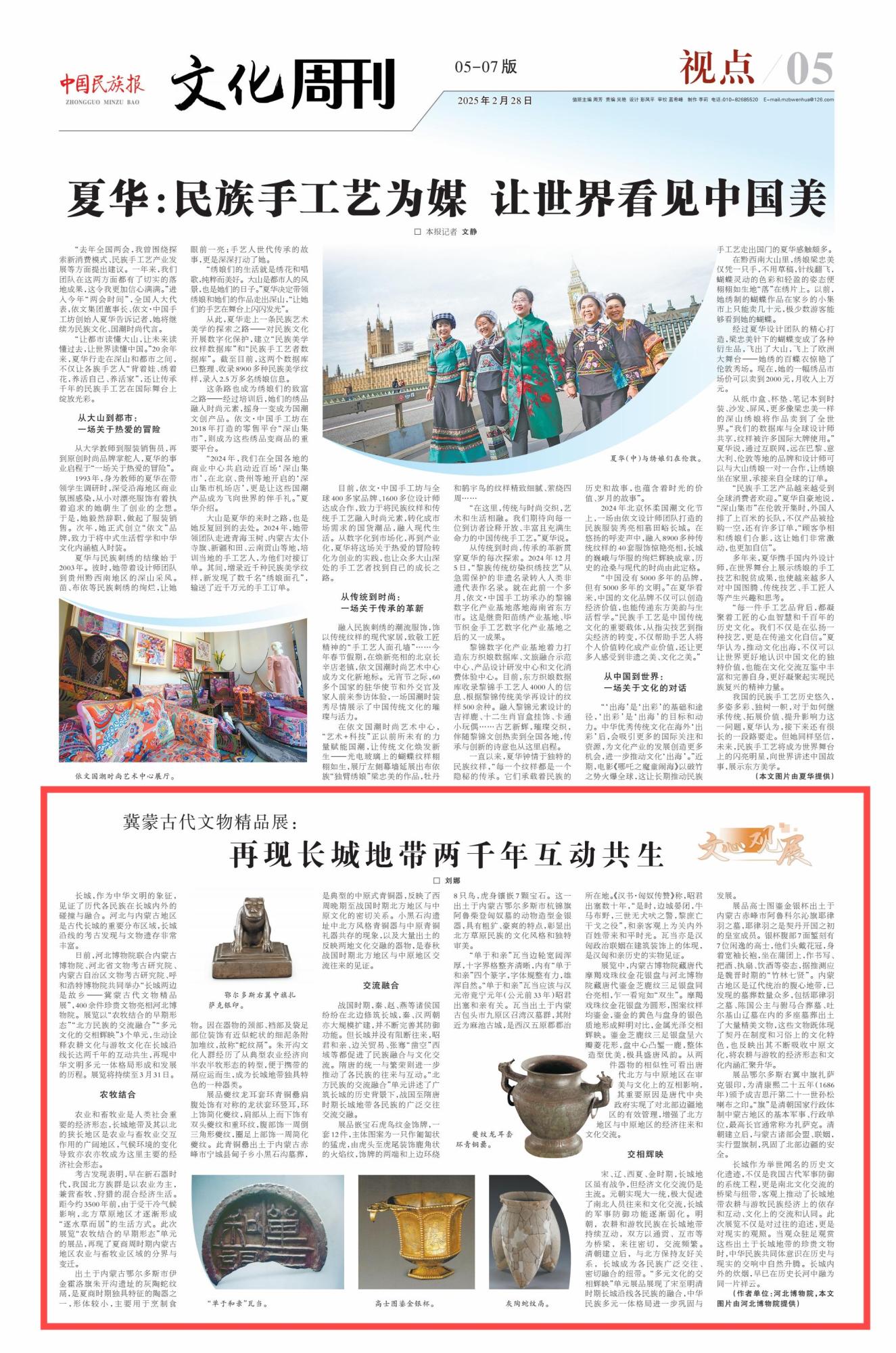 2025年2月28日,《中國民族報(bào)》第5版刊發(fā)題為《冀蒙古代文物精品展:再現(xiàn)長城地帶兩千年互動(dòng)共生》的文章,報(bào)道了河北博物院聯(lián)合內(nèi)蒙古博物院、河北省文物考古研究院、內(nèi)蒙古自治區(qū)文物考古研究院、呼和浩特博物院共同舉辦“長城兩邊是故鄉(xiāng)——冀蒙古代文物精品展”,400余件珍貴文物亮相河北博物院。
