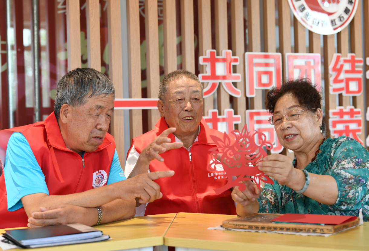 包頭市昆都侖區(qū)友誼19小區(qū)社區(qū)黨群服務中心紅石榴宣講團成員與社區(qū)居民一起剪紙。