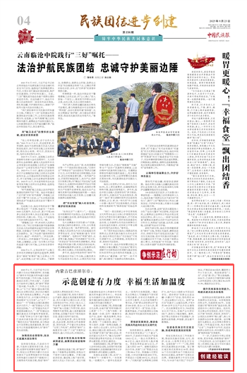 2025年9月23日,《中國民族報(bào)》第4版刊發(fā)題為《內(nèi)蒙古巴彥淖爾市:示范創(chuàng)建有力度 幸福生活加溫度》的文章,報(bào)道了2023年6月,習(xí)近平總書記在內(nèi)蒙古自治區(qū)考察調(diào)研時(shí),首次提出“鑄牢中華民族共同體意識(shí)是新時(shí)代黨的民族工作的主線,也是民族地區(qū)各項(xiàng)工作的主線”。巴彥淖爾市始終牢記囑托,將“鑄牢”貫穿于想問題、作決策、干工作的全過程。