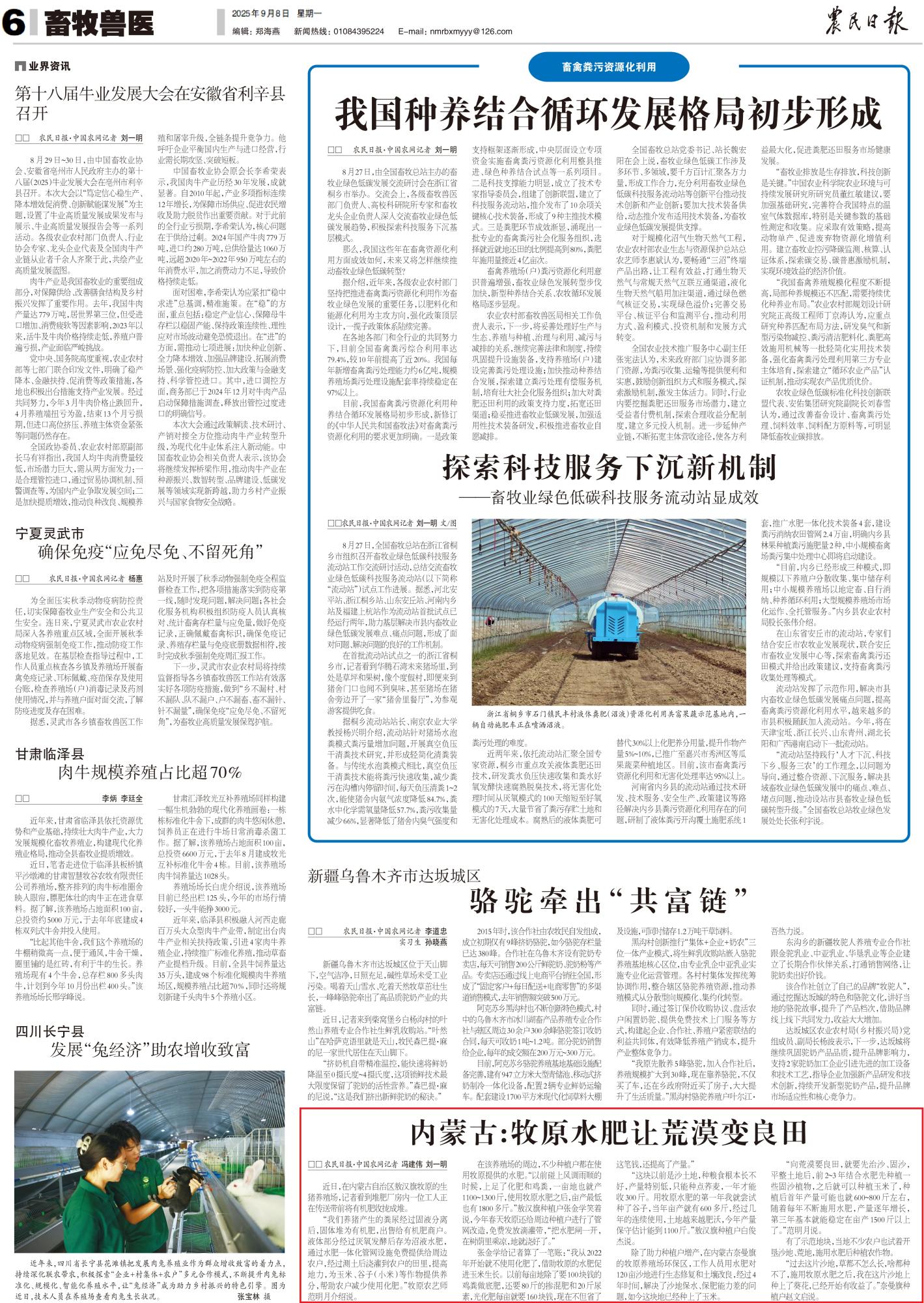 2025年9月8日,《農(nóng)民日報》第6版整版刊發(fā)題為《內(nèi)蒙古:牧原水肥讓荒漠變良田》的文章,報道了在內(nèi)蒙古奈曼旗的牧原養(yǎng)殖場環(huán)保區(qū),工作人員用水肥對120畝沙地進行生態(tài)修復和土壤改良,經(jīng)過4年時間,解決了沙地保水、保肥能力差的問題,如今這塊地已經(jīng)種上了玉米。