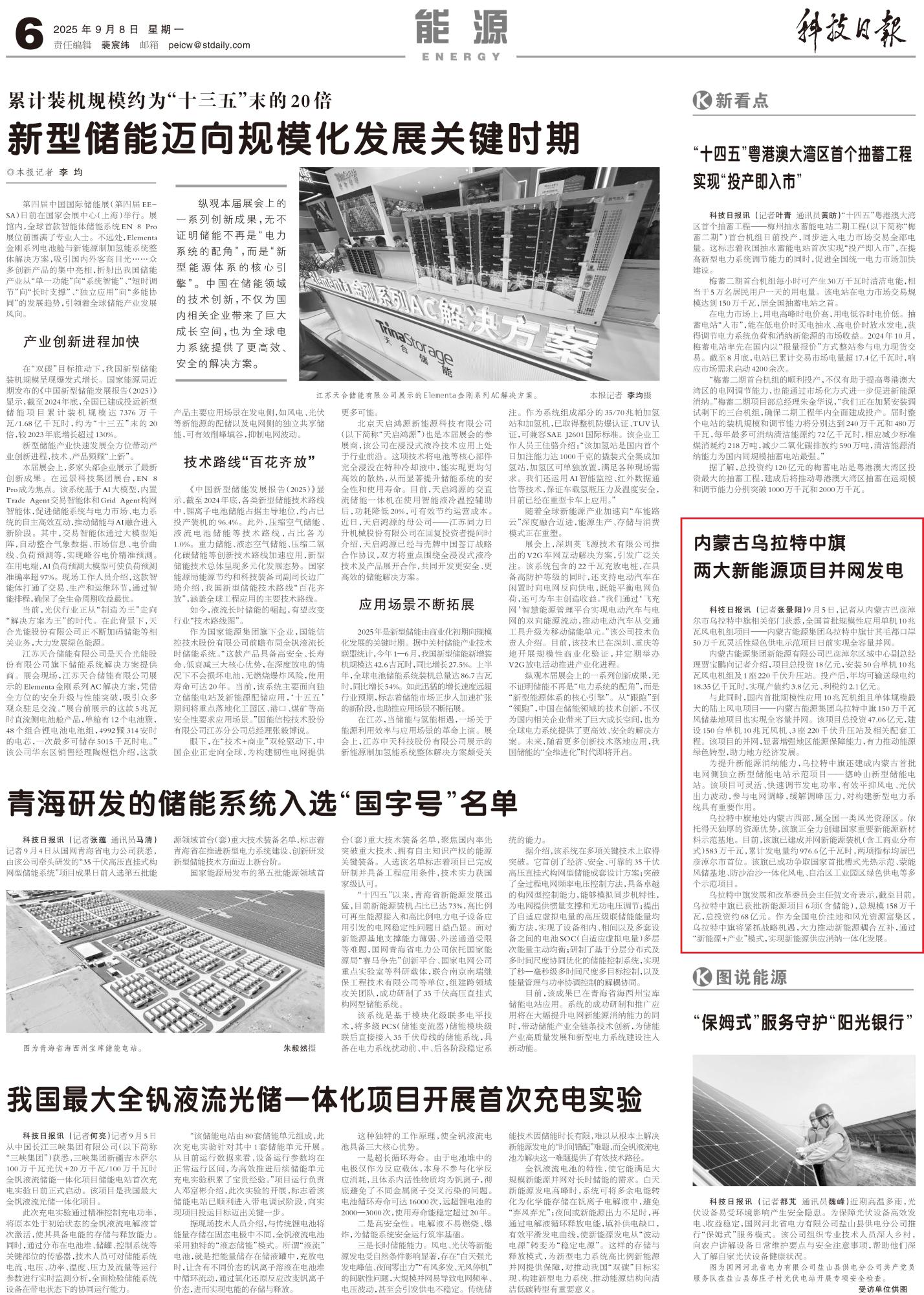 2025年9月8日,《科技日報》第6版整版刊發(fā)題為《內(nèi)蒙古烏拉特中旗兩大新能源項目并網(wǎng)發(fā)電》的文章,報道了記者從內(nèi)蒙古巴彥淖爾市烏拉特中旗相關(guān)部門獲悉,全國首批規(guī)模性應(yīng)用單機10兆瓦風(fēng)電機組項目——內(nèi)蒙古能源集團烏拉特中旗甘其毛都口岸50萬千瓦靈活性綠色供電示范項目日前實現(xiàn)全容量并網(wǎng)。