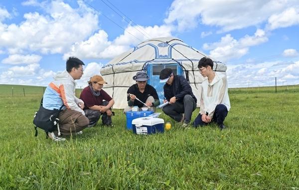 馬騰帶領團隊在內蒙古錫林郭勒大草原采集自然發(fā)酵乳。左三為馬騰。受訪者供圖