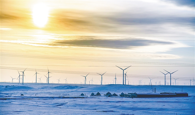 湛藍天幕之下,150座白色風車如鋼鐵巨人般巍然矗立,巨大的風機葉片迎風轉動,劃破長風,發(fā)出低沉而均勻的呼嘯,與天地間的遼闊寂靜共鳴。