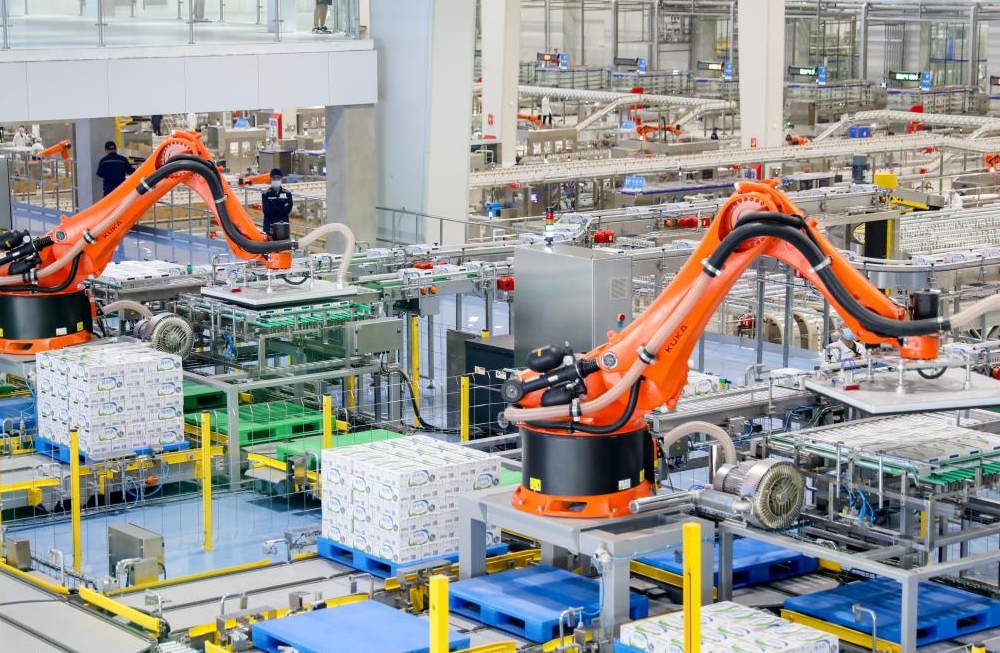 伊利現(xiàn)代智慧健康谷液態(tài)奶全球智造標(biāo)桿基地內(nèi),機(jī)械手在碼放牛奶。