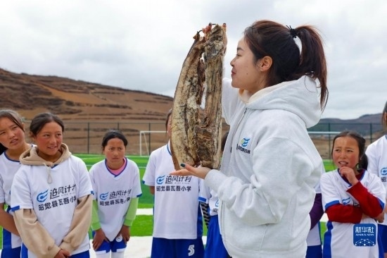 圖為四川籍的中國女足國腳萬佳瑤(前)獲贈瓦吾小學女足球隊員從家里帶來的臘肉(2023年3月3日攝)。