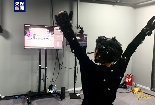 5月4日,游客在新昌穿巖十九峰景區(qū)夜游項(xiàng)目“山海經(jīng)奇”中體驗(yàn)燈光剪影。