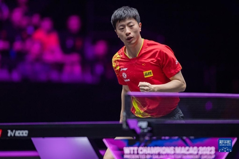 2023年4月22日,馬龍?jiān)诒荣愔?。?dāng)日,在澳門(mén)塔石體育館舉行的2023世界乒乓球職業(yè)大聯(lián)盟(WTT)澳門(mén)冠軍賽男子單打半決賽中,中國(guó)選手馬龍以4比1戰(zhàn)勝法國(guó)選手艾利克斯·勒布倫,晉級(jí)決賽。新華社記者 張金加攝