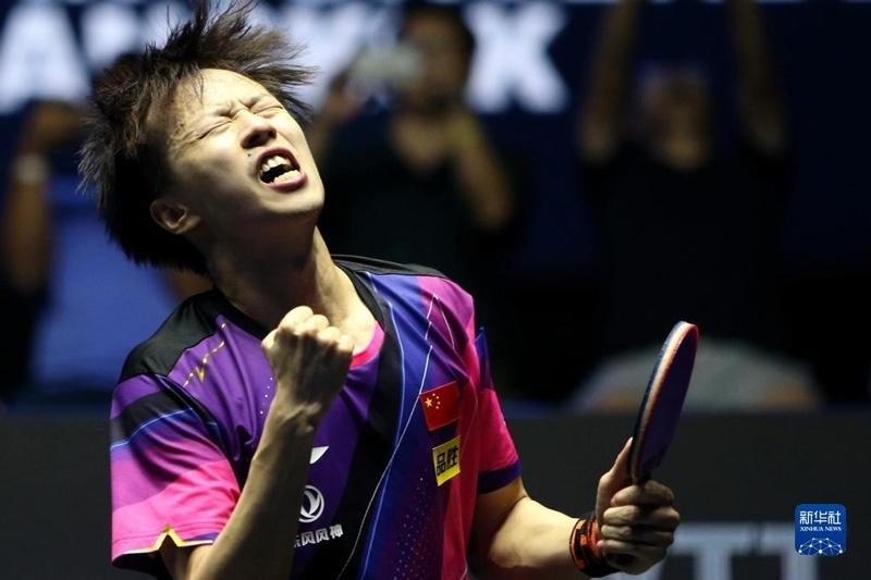 2023年4月14日,梁靖崑在比賽中慶祝得分。當(dāng)日,在河南新鄉(xiāng)舉行的世界乒乓球職業(yè)大聯(lián)盟(WTT)新鄉(xiāng)冠軍賽男單半決賽中,中國(guó)選手梁靖崑以4比2戰(zhàn)勝中國(guó)臺(tái)北選手林昀儒,晉級(jí)男單決賽。新華社記者  李嘉南攝