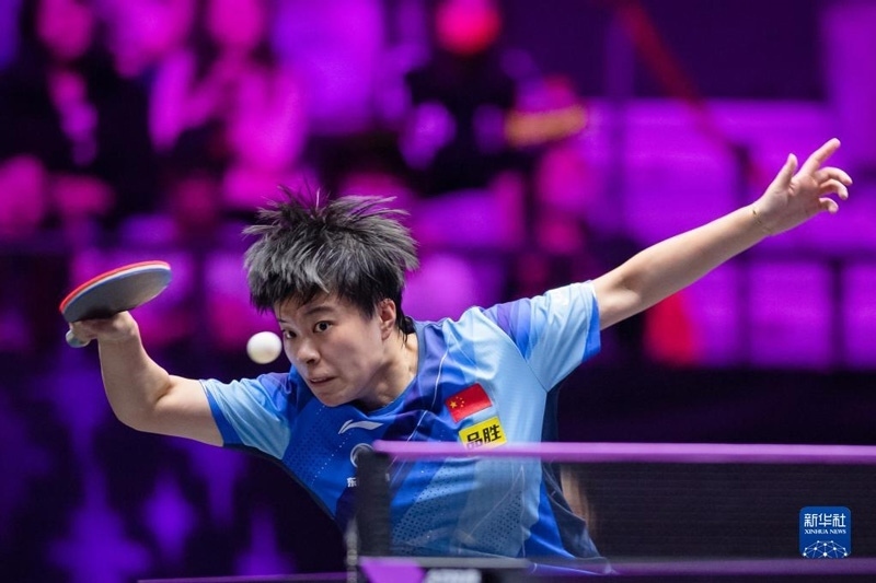 2023年4月20日,中國(guó)選手王藝迪在比賽中回球。當(dāng)日,在澳門(mén)塔石體育館舉行的2023世界乒乓球職業(yè)大聯(lián)盟(WTT)澳門(mén)冠軍賽女子單打比賽中,中國(guó)選手王藝迪以3比2戰(zhàn)勝波多黎各選手阿德里安娜·迪亞茲,晉級(jí)八強(qiáng)。
