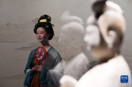 5月22日晚,在西安博物院《長安有故里——絲路少年大唐行》展覽上,身著復原唐裝的演員與游客互動。