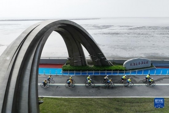 9月17日,騎行愛好者在啟東市江海文化景觀大道騎行(無(wú)人機(jī)照片)。