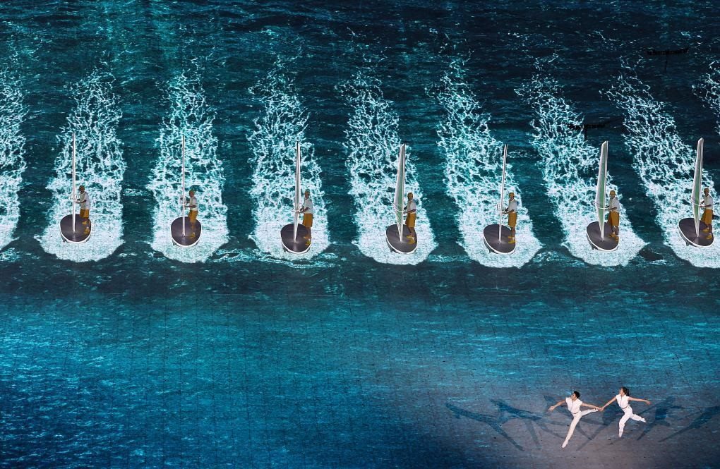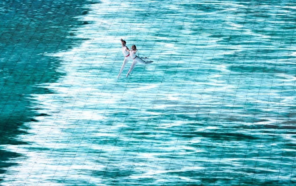 本屆亞運會首次將3D雙威亞技術(shù)應(yīng)用于大型運動場中。立體飛旋于空中的男女演員與潮共舞,吊著威亞的他們在空中完成了各種高難度動作,并與地屏中的浪潮實時互動,踏浪而行,成就了科技與藝術(shù)完美融合。
