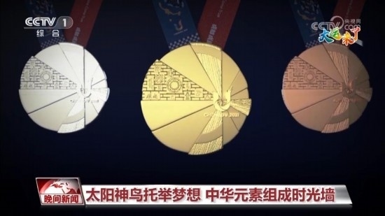 再來看圖案。獎牌正面設計賦予“太陽神鳥”羽翼幾何感,與賽會會徽“U”呼應,猶如神鳥振翅欲飛,寓意守護夢想,自信昂揚,飛往多彩未來。同時,在幾何扇面嵌入一塊包含多種中華文明代表元素為底紋的絢麗時光墻,以呈現(xiàn)中國五千年文明的璀璨輝煌和演變歷史。