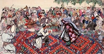 繞過紅色展墻,黃胄于1962年創(chuàng)作的《豐樂圖》赫然在目,拉開了展覽第一篇章的序幕?;▓F錦簇的地毯上擺滿瓜果,人們圍坐在一起載歌載舞,歡慶豐收。畫面中的眾多人物雖姿態(tài)各異,但都喜笑顏開,感染著觀者。作品描繪出熱烈的慶祝場面,富有濃郁的地域特色,是新疆各族人民團結(jié)和睦、意氣風發(fā)的生動寫照。