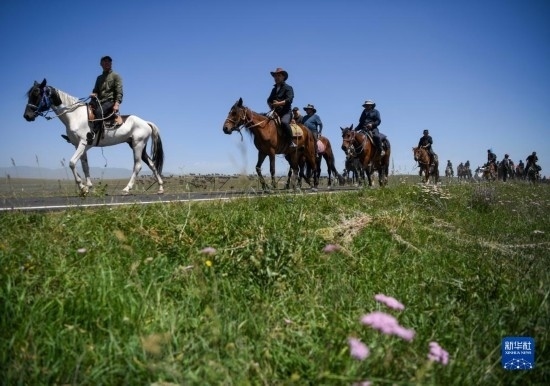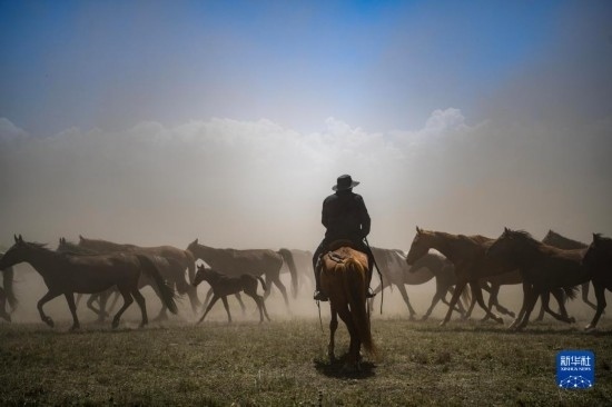 7月16日,牧民在昭蘇縣天馬旅游文化園的草原上遛馬。