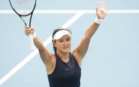 8月6日,中國(guó)隊(duì)選手郭涵煜在獲得網(wǎng)球女單冠軍后慶祝勝利。新華社記者 江宏景 攝
