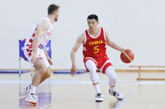 7月15日,在克羅地亞奧帕蒂亞舉行的一場男子籃球友誼賽,中國隊球員方碩(右)在比賽中運球。新華社發(fā)(內爾·帕夫萊蒂奇攝)