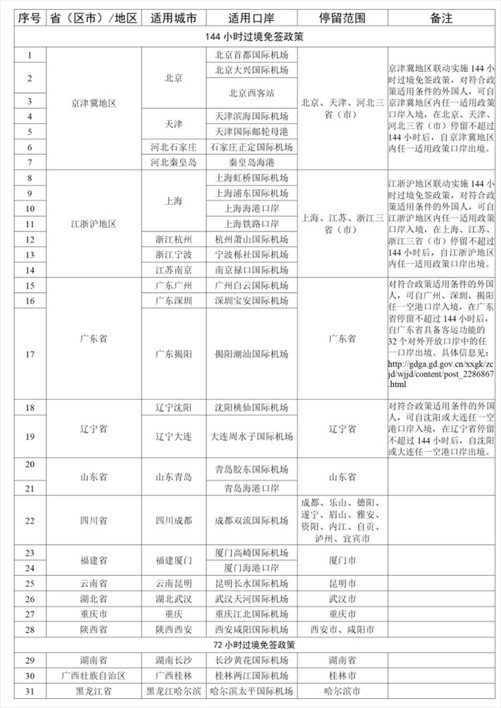 如外國人符合上述條件,可向我國20個城市的邊檢機關提出辦理144小時過境免簽申請,或向3個城市的邊檢機關提出辦理72小時過境免簽申請,其他城市暫未實施該項政策。