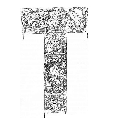 需要指出的是,這一進(jìn)程和墓主人辛追靈魂升仙的進(jìn)程是同步的。馬王堆漢墓T形帛畫的構(gòu)圖和漢代畫像石天界、人間、地下世界的三段模式非常近似,所以很多學(xué)者據(jù)此將T形帛畫也劃分為天界、人間、地下三部分。但這種看法我不贊成。我比較贊同T形帛畫的主題是引魂升天的主張。日本京都大學(xué)教授曾部川寬對(duì)漢代靈魂升仙的主題有非常深入的研究。1981年他出版的《向昆侖山升仙——古代中國(guó)人描繪的死后世界》(《崑崙山への昇仙——古代中國(guó)人が描いた死後の世界》)中,指出這幅非衣的主題就是升仙主題。整幅T形帛畫描述的是墓主人辛追升仙的進(jìn)程。從下到上,T形帛畫中央整個(gè)中軸貫穿著的是一個(gè)升騰的主題。陰陽(yáng)兩條龍自下而上在中央部分穿璧而過(guò),托舉起魂車?;贶嚿系暮诵娜宋锿ǔUJ(rèn)為就是墓主人辛追。按照這一解釋,中間部分描繪的并不是我們生活的人間,而是從地下向天界升騰的墓主人辛追不斷升向仙界的魂魄。畫面上她的魂魄正被二龍牽引的魂車引向天門。從時(shí)間上說(shuō),辛追的魂魄將要進(jìn)入的,同樣是由死亡而再生的進(jìn)程。