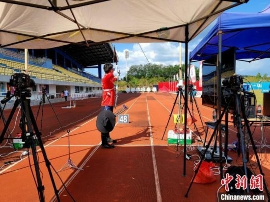 國家體育訓練南方基地(海南白沙·綜合),國家射箭隊運動員在技術分析靶場練習。中新網(wǎng)記者王曉斌攝