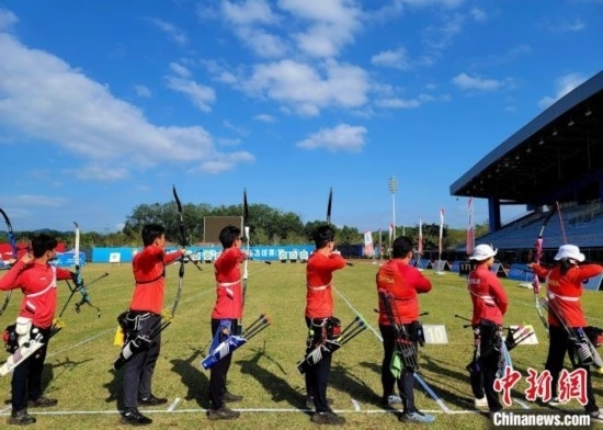 國家體育訓練南方基地(海南白沙·綜合),國家射箭隊紅隊在進行一場隊內賽。 中新網(wǎng)記者 王曉斌 攝