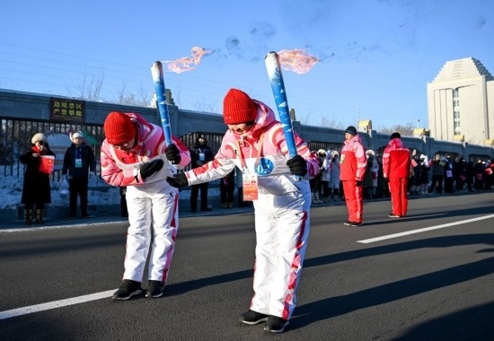 2月3日,在內(nèi)蒙古呼倫貝爾市滿洲里國(guó)門(mén)景區(qū),火炬手包玲玲(右)和錢(qián)卓在火炬?zhèn)鬟f活動(dòng)中。新華社記者 連振 攝
