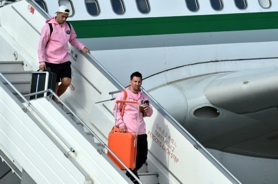 2月2日,梅西與其效力的邁阿密國際隊(duì)抵達(dá)香港國際機(jī)場(chǎng),圖為梅西(右)與蘇亞雷斯走下舷梯。新華社記者 盧炳輝 攝