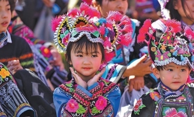 在直苴村“賽裝節(jié)”上,小朋友們身著精美的彝族服飾。田維星攝(影像中國)