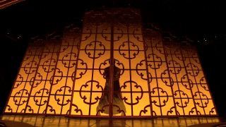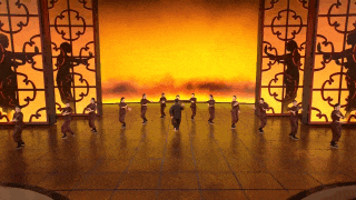 《詠春》來(lái)自舞劇《詠春》選段,已經(jīng)上演了百場(chǎng),但在春晚是個(gè)特別的版本。為了創(chuàng)造出更加意蘊(yùn)豐富的想象空間,總臺(tái)臺(tái)長(zhǎng)慎海雄在推薦這個(gè)舞劇片段時(shí),提出了幾個(gè)建議,包括演員服裝從黑色的香云紗改為絳紅色,男女主角之間的關(guān)系要從男主角一一過(guò)招“大敗”女主角改為相互切磋武藝,開場(chǎng)以男主角的武術(shù)剪影來(lái)增強(qiáng)吸引力,通過(guò)使用剪影效果來(lái)展現(xiàn)“葉問(wèn)”的出場(chǎng)。當(dāng)燈光亮起,窗欞上“詠春拳”三個(gè)書法大字淡去,“葉問(wèn)”的剪影如同舞動(dòng)的水墨畫一般,隨即演員閃身舞出屏風(fēng),影子與真身共舞。由虛入實(shí),由平面到立體,“剪影”的設(shè)計(jì)讓短短半分鐘的獨(dú)舞大大增加了層次感和觀賞性,為空曠的舞臺(tái)創(chuàng)造出一個(gè)“頂天立地”的葉問(wèn)之影,視覺(jué)震撼瞬間放大,堪稱畫龍點(diǎn)睛之筆。