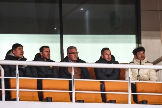3月6日,中國國家男子足球隊主教練伊萬科維奇(中)在2023-2024賽季亞冠聯賽四分之一決賽首回合現場觀看比賽。新華社記者 朱崢 攝