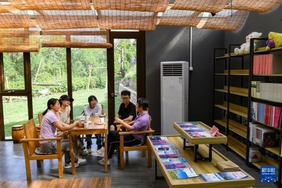 北京石油化工學院的師生在石峽村的一間書屋里就鄉(xiāng)村文旅調(diào)研進行討論(5月31日攝)。