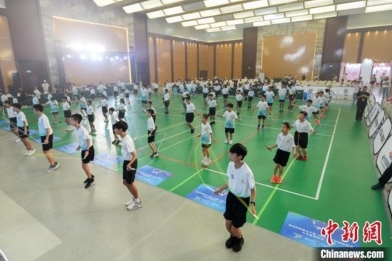 8月13日,首屆海峽兩岸(福州)青少年跳繩錦標(biāo)賽開賽,選手正在進(jìn)行賽前熱身百人跳。 包華 攝