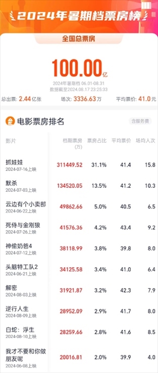 據網絡平臺實時數據,截至8月17日23時25分,2024年暑期檔(6月-8月)檔期總票房(含預售)突破100億元。