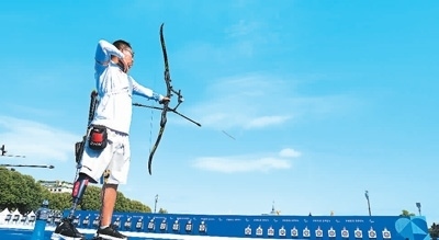 當(dāng)?shù)貢r(shí)間8月24日,在法國(guó)巴黎榮軍院旁的射箭訓(xùn)練場(chǎng)內(nèi),中國(guó)殘奧射箭隊(duì)在進(jìn)行適應(yīng)性訓(xùn)練。拉弓、瞄準(zhǔn)、松弦,中國(guó)隊(duì)選手甘俊射出正中靶心的一箭后,臉上露出笑容。他表示:“風(fēng)速、風(fēng)向?qū)穆潼c(diǎn)影響較大,我會(huì)盡快適應(yīng),調(diào)整到最佳狀態(tài)?!备士?duì)自己參加的首屆殘奧會(huì)充滿期待。