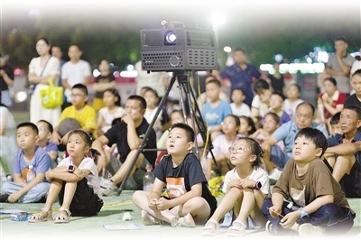 近日,在湖北省襄陽(yáng)市保康縣體育場(chǎng),孩子們?cè)谟^看電影。楊 韜攝(人民視覺(jué))