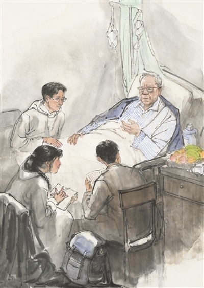 人民教師勤學(xué)篤行、求是創(chuàng)新的躬耕態(tài)度,給無數(shù)人以榜樣的力量,也給美術(shù)創(chuàng)作以靈感?!叭嗣窠逃摇眹覙s譽(yù)稱號(hào)獲得者衛(wèi)興華,終其一生都奮斗在勤學(xué)求真的道路上。90余歲時(shí),即使病痛纏身,他仍堅(jiān)持每天學(xué)習(xí)、工作。有感于衛(wèi)興華教授的敬業(yè)精神,高毅特意描繪了臥病在床的衛(wèi)興華堅(jiān)持與學(xué)生探討學(xué)術(shù)課題的場(chǎng)景,主人公那專注的神情令人動(dòng)容。像衛(wèi)興華這樣堅(jiān)守耕耘的教師還有許多。劉昌明水彩畫《一個(gè)教師的工作臺(tái)》便以細(xì)致的場(chǎng)景描繪表達(dá)出對(duì)教師群體的敬意。貼著泛黃舊紙的墻面、藥瓶和墨水瓶之間的教案、脫漆的木桌、一副老花眼鏡……畫家在此調(diào)動(dòng)了一切能夠反映老一輩教育者辛勤伏案的元素,象征著沒有直接出場(chǎng)的教師形象?!按颂師o聲勝有聲”的表達(dá)效果,令人回味無窮。