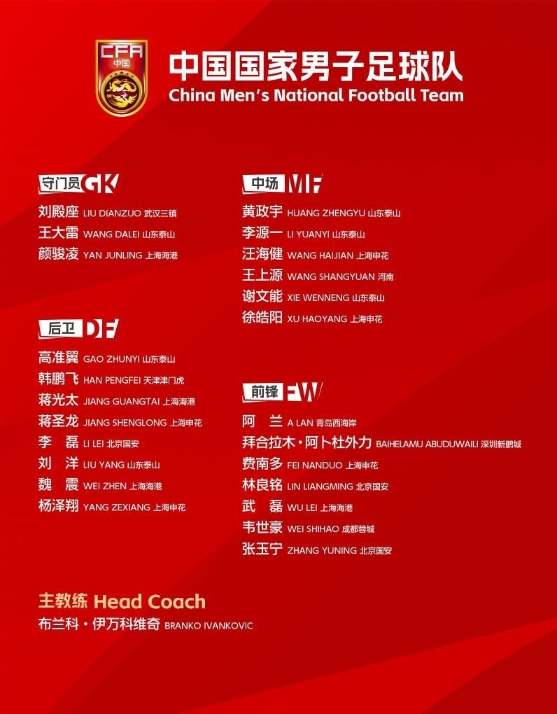 以下為24人大名單:武磊、顏駿凌、蔣光太、魏震(上海海港),王大雷、劉洋、高準(zhǔn)翼、黃政宇、謝文能、李源一(山東泰山),韋世豪(成都蓉城),費(fèi)南多、蔣圣龍、徐皓陽(yáng)、楊澤翔、汪海?。ㄉ虾I昊ǎ?,李磊、張玉寧、林良銘(北京國(guó)安),劉殿座(武漢三鎮(zhèn)),韓鵬飛(天津津門虎),王上源(河南),拜合拉木·阿卜杜外力(深圳新鵬城),阿蘭(青島西海岸)。