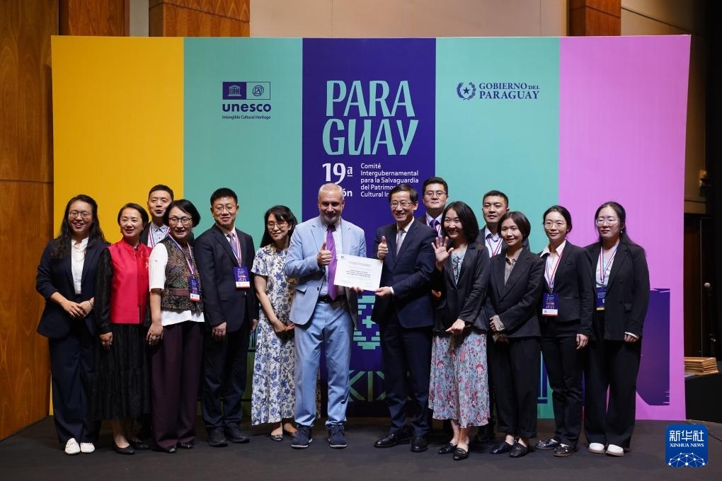 12月5日,在巴拉圭亞松森舉行的聯(lián)合國教科文組織保護非物質(zhì)文化遺產(chǎn)政府間委員會第19屆常會現(xiàn)場,中國代表上臺領(lǐng)取證書。新華社記者 朱雨博 攝