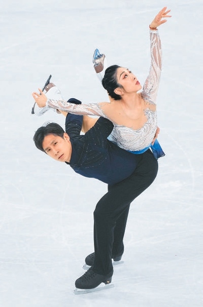 北京冬奧會上,中國花樣滑冰選手隋文靜與韓聰在比賽中。