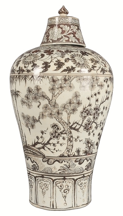 明洪武釉里紅歲寒三友圖梅瓶(南京博物院藏)。